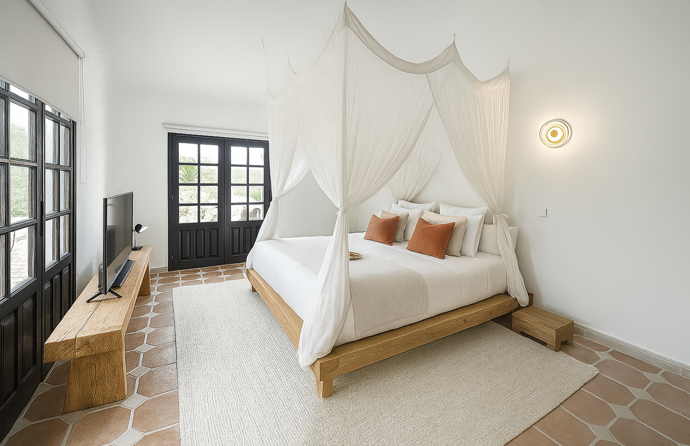 Deixe-se acordar com um beijo da paisagem. Esta suite espaçosa, com janela panorâmica, oferece vistas sobre vales e palmeiras ao vento. No interior, tudo é amplo e luxuoso, com uma sala de estar acolhedora, uma pequena pantry prática e uma casa de banho generosa com banheira e um duche de chuva separado. O quarto, com o seu alto teto de vigas, convida a relaxar de verdade. Mesmo junto à piscina e com varanda privativa, é o lugar perfeito para manhãs tranquilas e longas noites descontraídas.